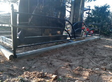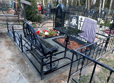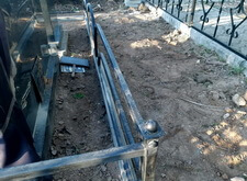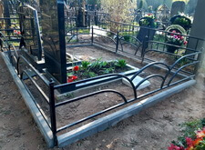 Первым делом мы установили периметр могилы, собранный из бордюрных пролётов. Для этого под оградой была выкопана неглубокая канава, позволяющая надёжно закрепить бетонные плиты в землю. Примыкающие к опорам ограждения блоки были немного подрезаны.
